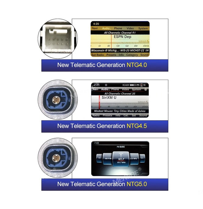 Vær sikker på at vælge den korrekte variant, der passer til din bils NTG 4.5 eller NTG 5.0 system. Dette sikrer kompatibilitet og fuld funktionalitet.